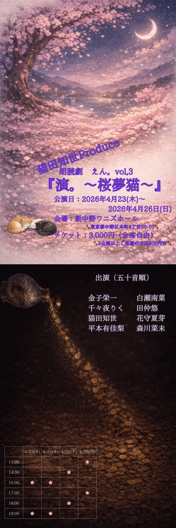 | 出演キャスト募集 稽古は1枠1ペアずつ (役者2名+演出1名) 合計3名のみで行います 1回の稽古は約2時間 本番までの稽古日程は ご相談の上決定します 公演は30分のふたり芝居を 2作品または3作品です (上演時間/約60分~90分) |