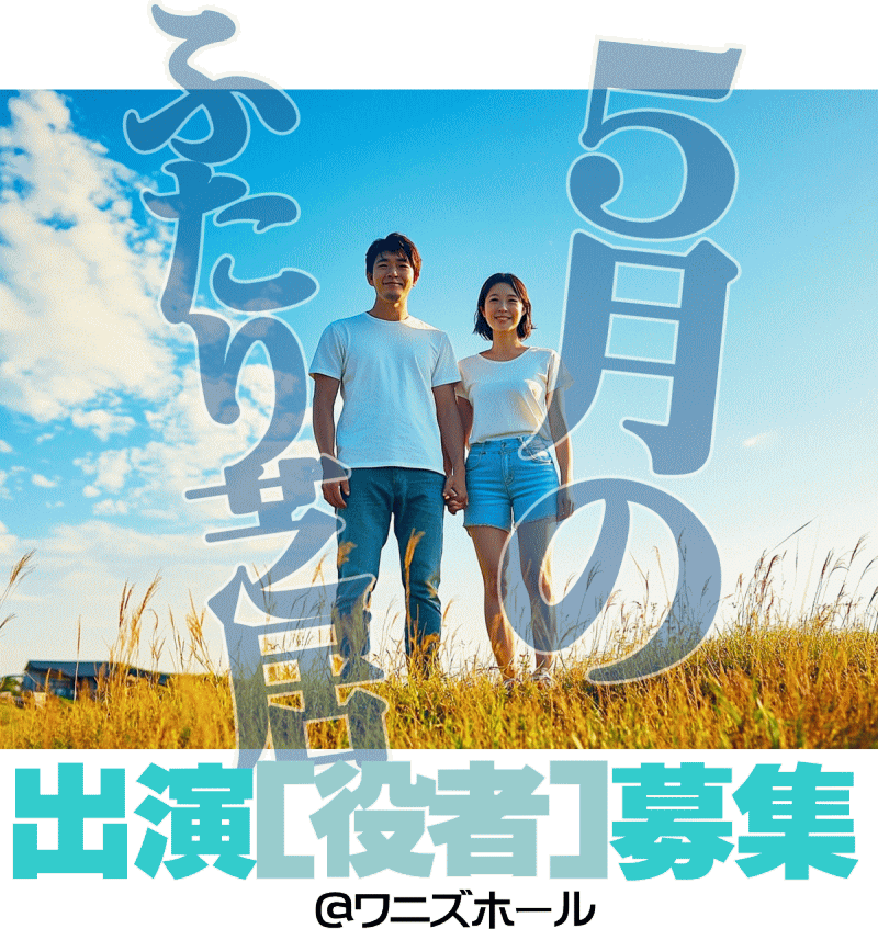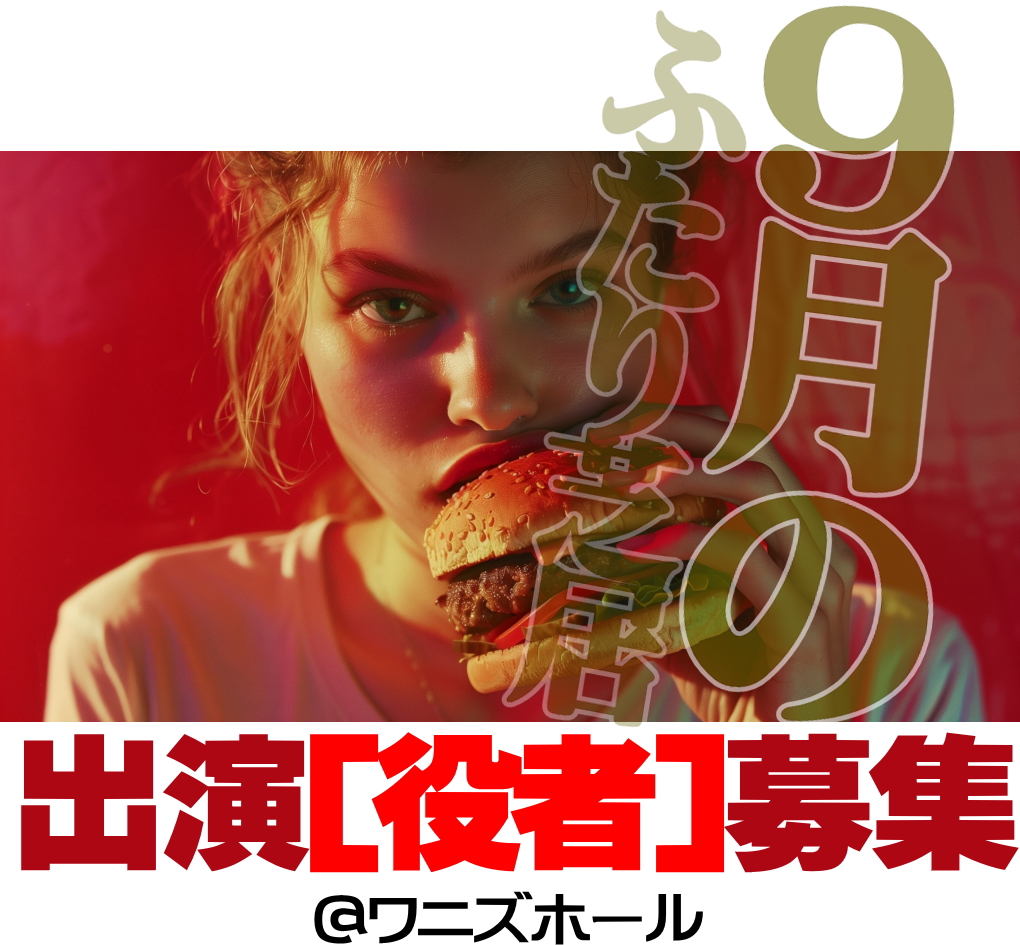 | @ご出演可能な日程や、ご希望の公演日があればお聞かせ下さい。 Aご出演にあたってご要望などございましたら、お聞かせください。 Bその他、ご不明な点があれば、どうぞ遠慮なくお問合せ下さい。 「ふたり芝居/出演希望」と書いてwanizhall@gmail.com 迄 |