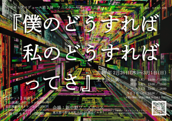 | 出演キャスト募集 稽古は1枠1ペアずつ (役者2名+演出1名) 合計3名のみで行います 1回の稽古は約2時間 本番までの稽古日程は ご相談の上決定します 公演は30分のふたり芝居を 2作品または3作品です (上演時間/約60分~90分) |