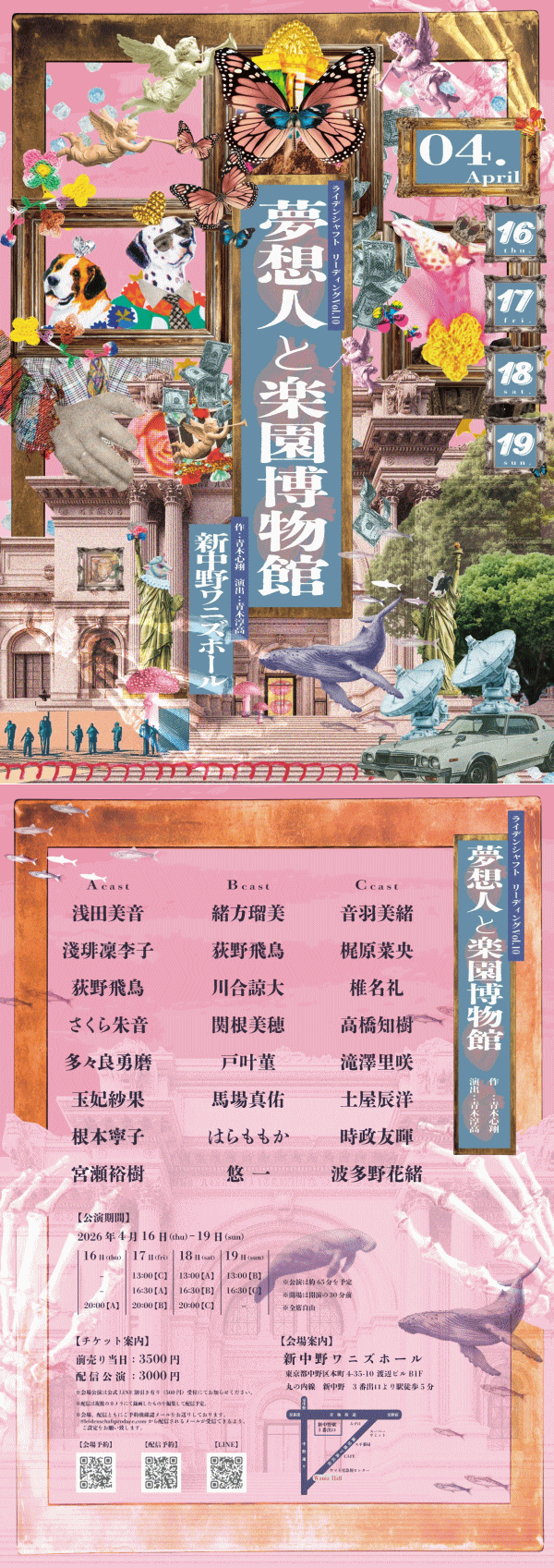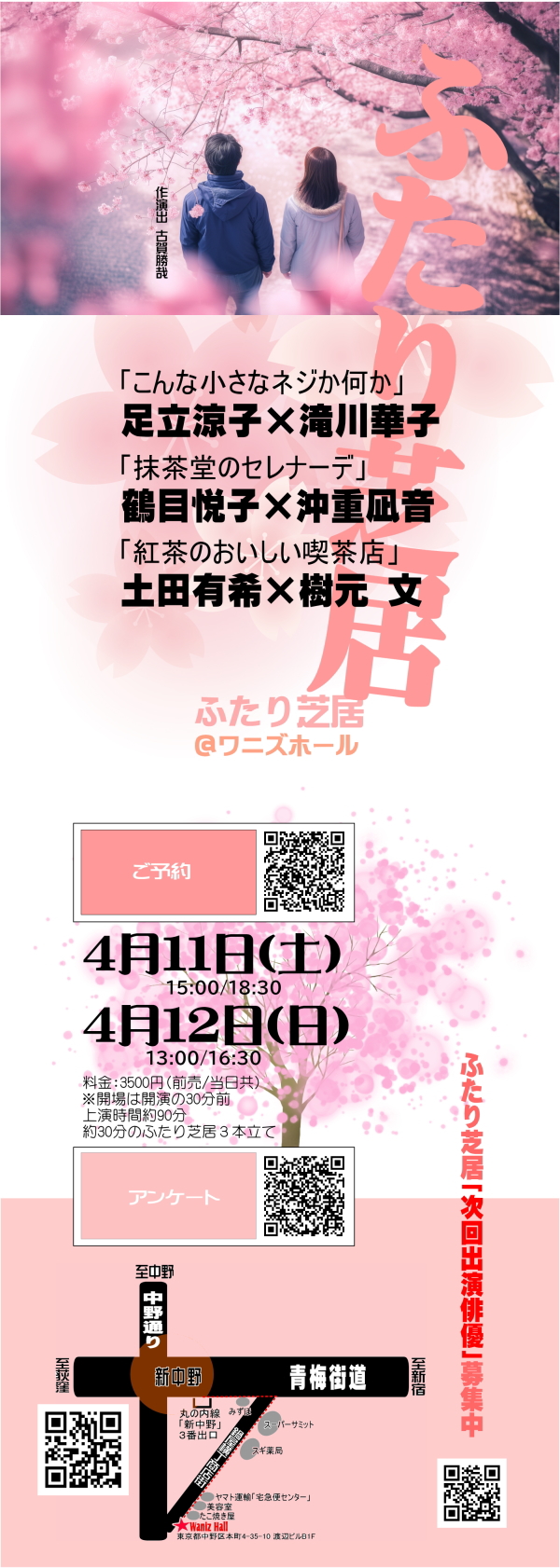 | 出演キャスト募集 稽古は1枠1ペアずつ (役者2名+演出1名) 合計3名のみで行います 1回の稽古は約2時間 本番までの稽古日程は ご相談の上決定します 公演は30分のふたり芝居を 2作品または3作品です (上演時間/約60分~90分) |